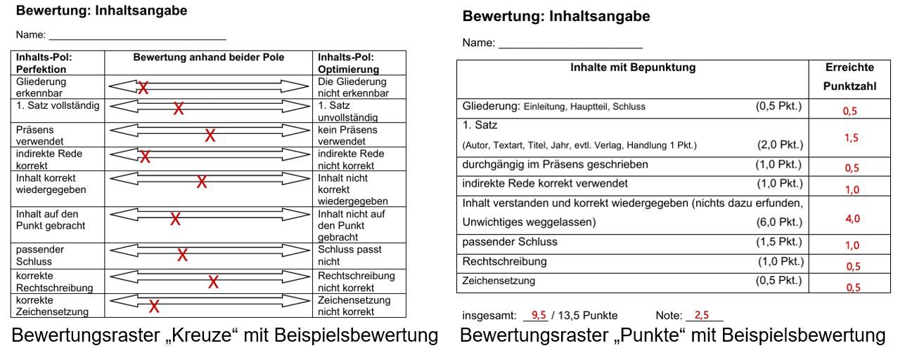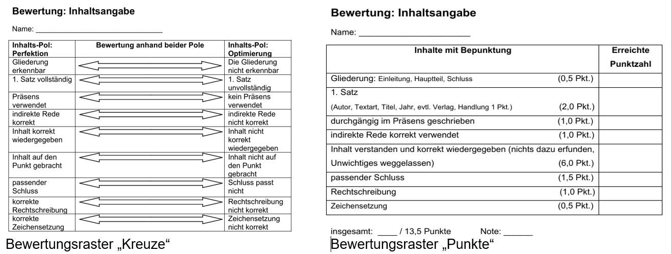 Meine Freundin sowie Kollegin und ich bewerten schriftliche Aufsätze in Deutsch unterschiedlich. Während sie ein Bewertungsraster hat, in dem sie verschiedene Bewertungskriterien mit Polen darstellt und Kreuze an entsprechenden Stellen macht, bepunkte ich die Aufsätze meiner Schülerinnen und Schüler.